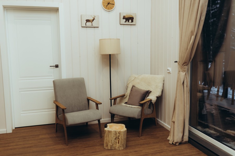 - Мебель: вешалка, диван, зеркало, кровать двуспальная, прикроватные столики, стол, столик журнальный, стулья, шкаф